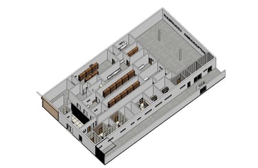 Galpão comercial com área construída de 550 m², elaboramos desde o projeto de arquitetura, estrutural, elétrico, hidráulico, sanitário e projeto de interior. Executamos toda a obra.